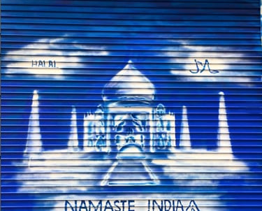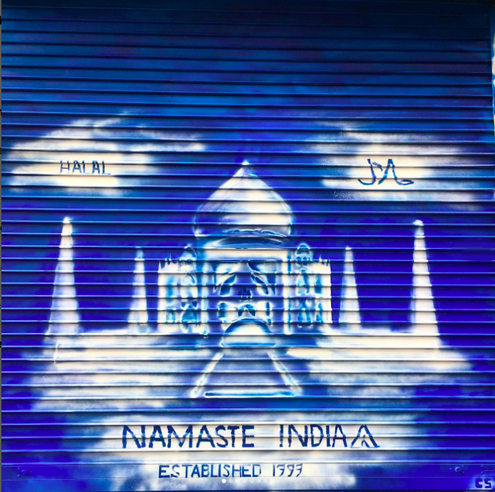 Created a new brand identity for Namaste India Restaurant. The front shutter got a new mural design and the business cards and menu were made to match this façade.